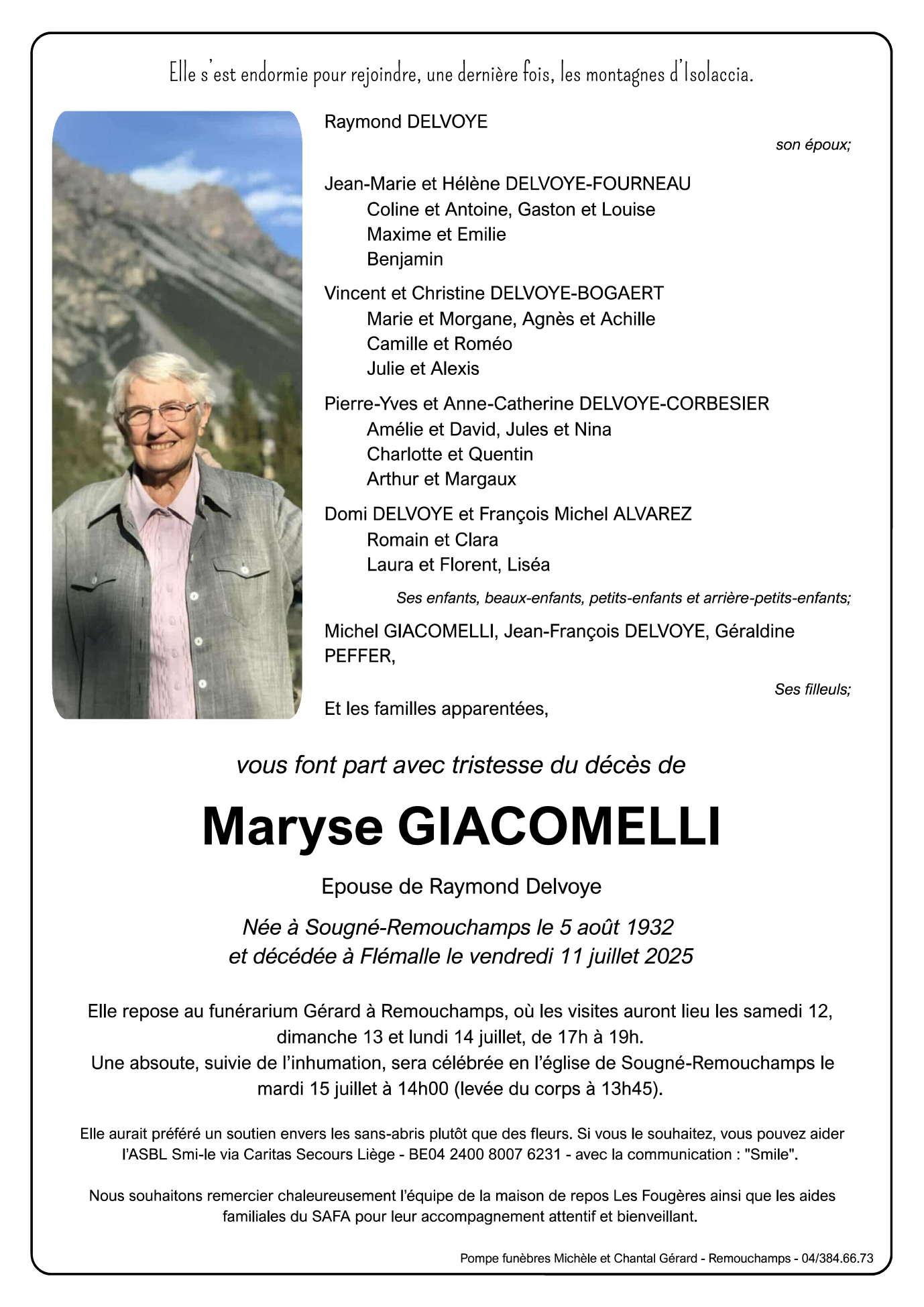 Décédée à Flémalle (4400) le vendredi 11 juillet 2025 à l'âge de 92 ans