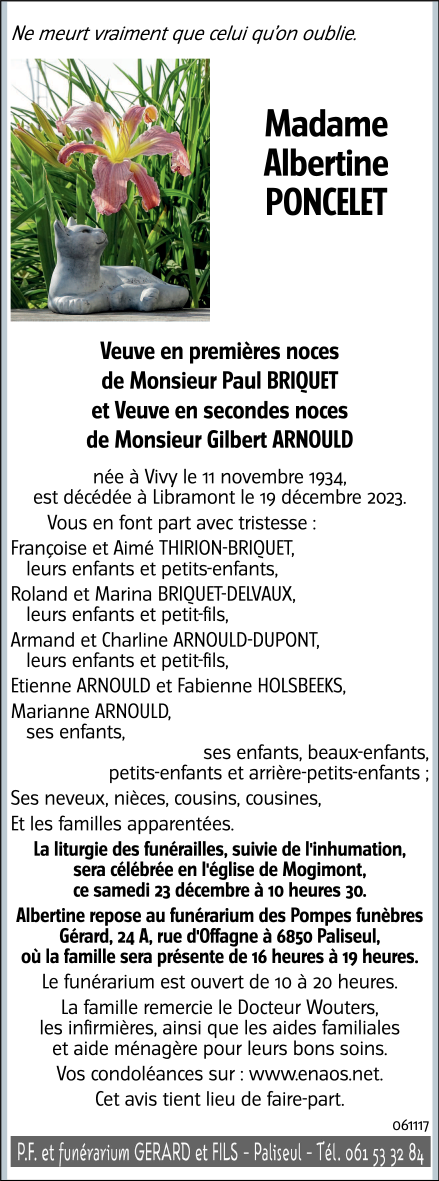 Fallecida en Libramont (6800) el martes, 19 de diciembre de 2023 a la edad de 89 años