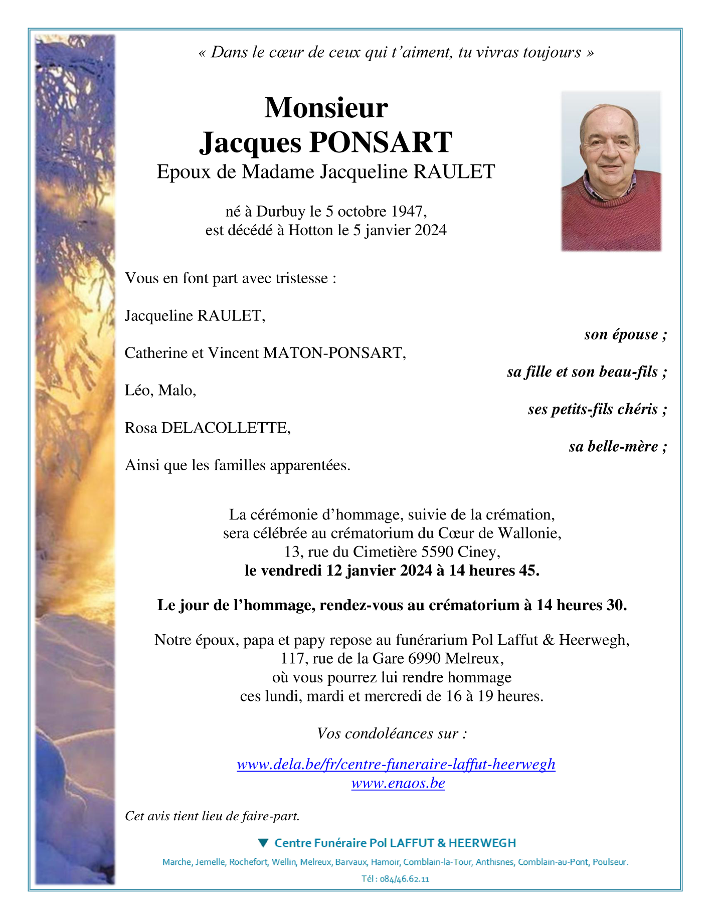 Overleden te Hotton (6990) op vrijdag 5 januari 2024 op 76-jarige leeftijd