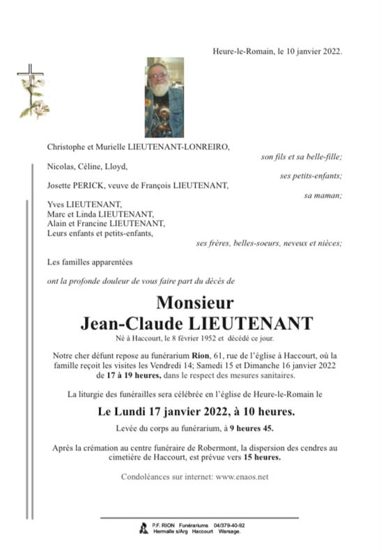 Décédé à Hermalle-sous-Argenteau (4681) le lundi 10 janvier 2022 à l'âge de 69 ans