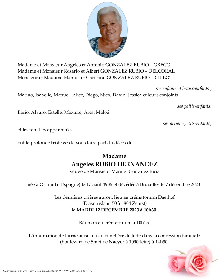 Décédée à Bruxelles (Laeken) (1020) le jeudi 7 décembre 2023 à l'âge de 87 ans