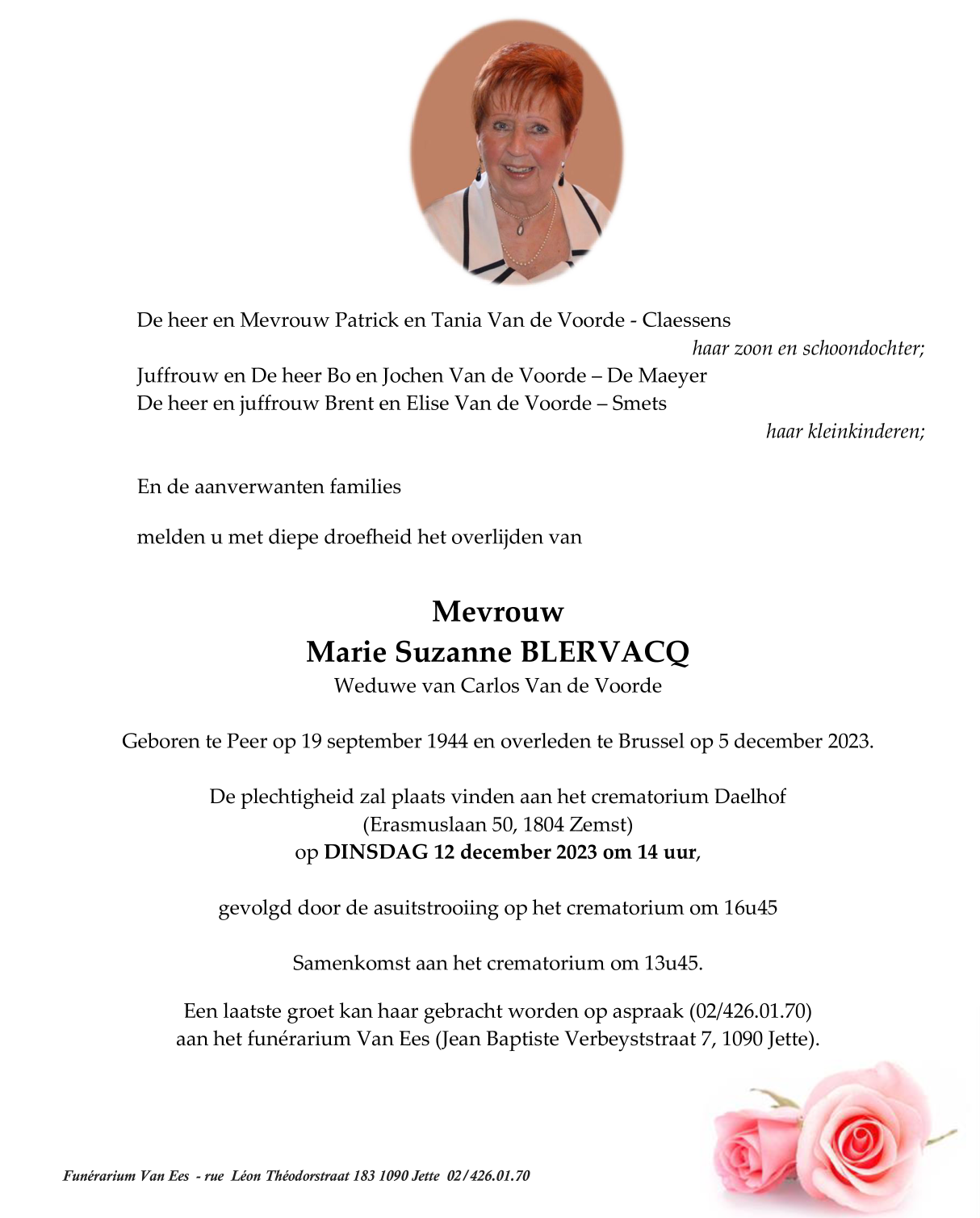 Fallecida en Brussel (1000) el martes, 5 de diciembre de 2023 a la edad de 79 años