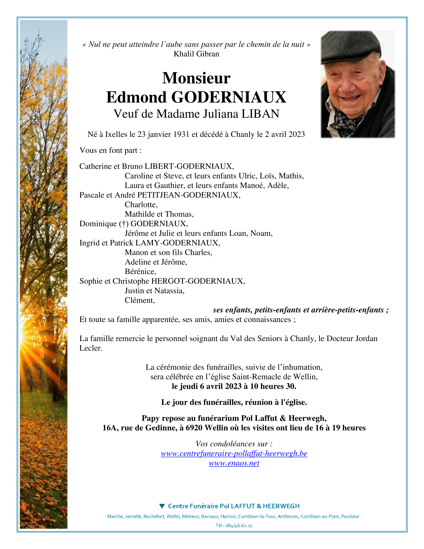 Décédé à Chanly (6921) le dimanche 2 avril 2023 à l'âge de 92 ans