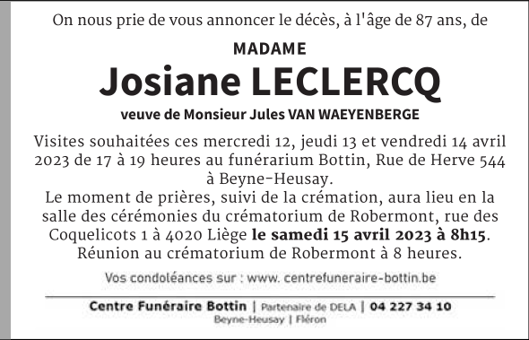 Décédée à Hermalle-sous-Argenteau (4681) le samedi 8 avril 2023 à l'âge de 87 ans