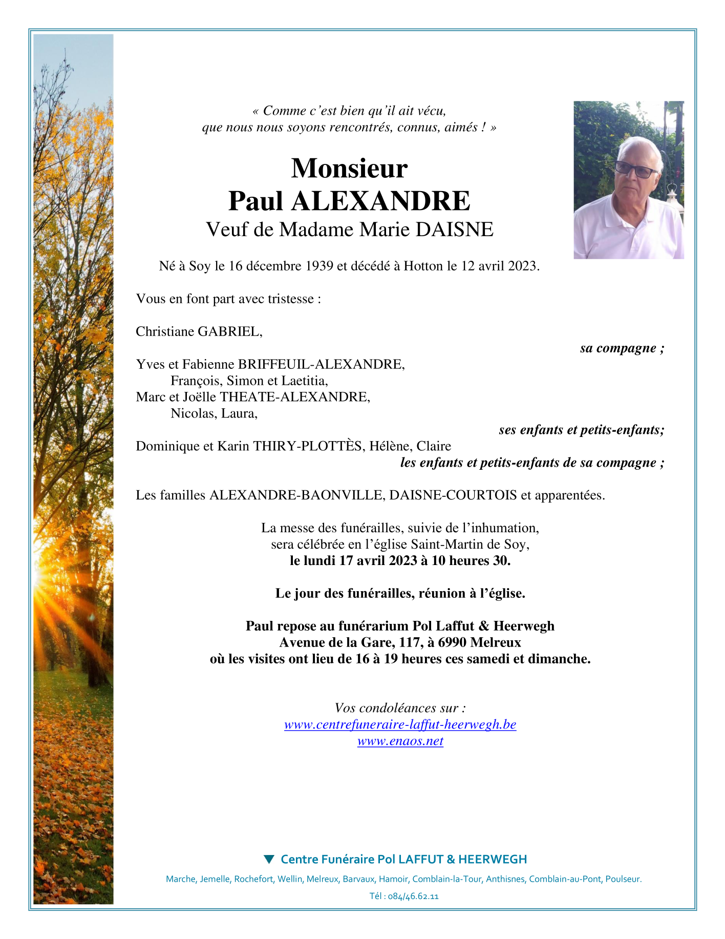 Died in Hotton (6990) on 12 April 2023 at the age of 83 years
