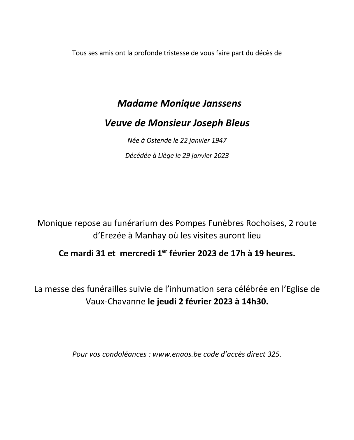 Fallecida en Liège (4000) el domingo, 29 de enero de 2023 a la edad de 76 años