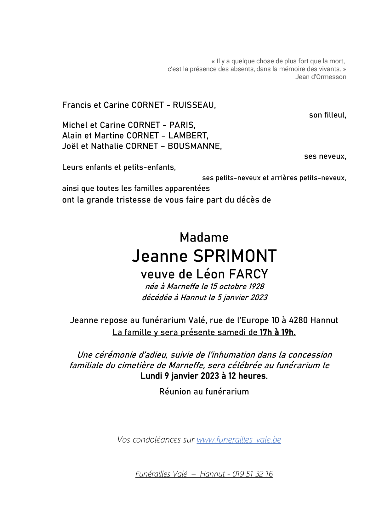 Madame Jeanne FARCY geboren SPRIMONT