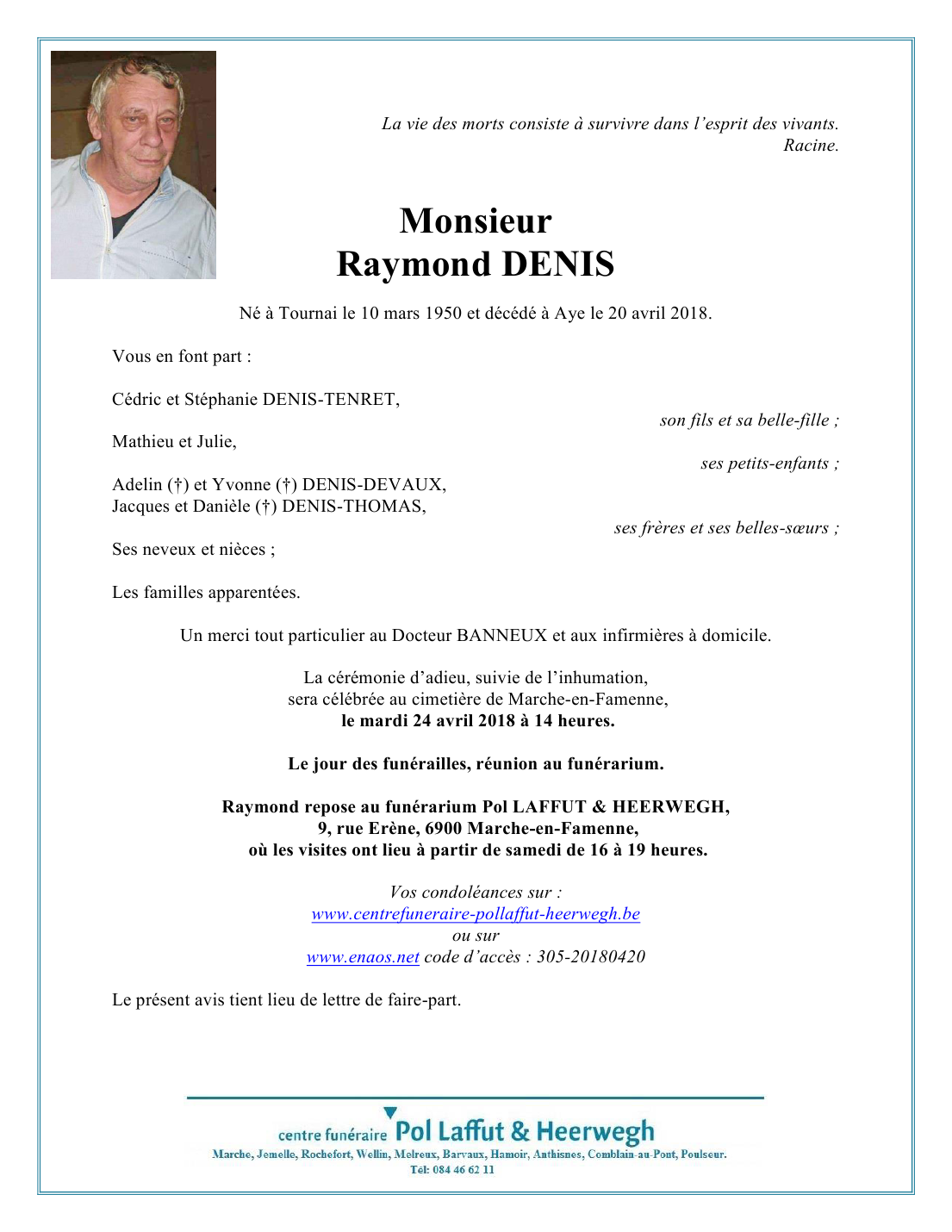 Fallecido en Aye (6900) el viernes, 20 de abril de 2018 a la edad de 68 años