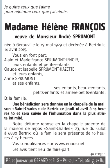 Overleden te Bertrix (6880) op dinsdag 14 april 2015 op 85-jarige leeftijd