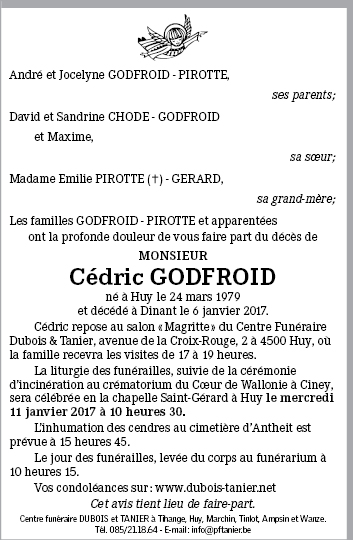 Décédé à Dinant (5500) le vendredi 6 janvier 2017 à l'âge de 37 ans