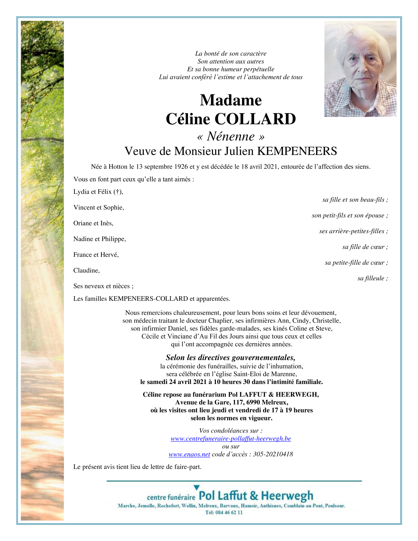 Died in Menil-Favay (6990) on 18 April 2021 at the age of 94 years