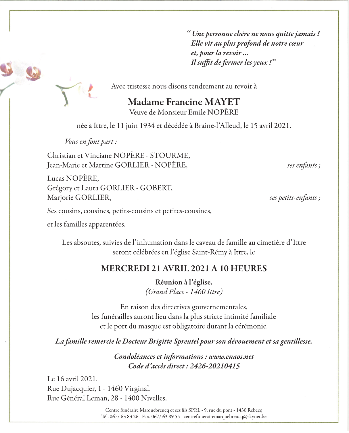 Overleden te Braine-l'Alleud (1420) op donderdag 15 april 2021 op 86-jarige leeftijd