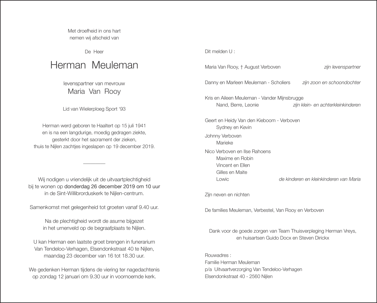Overleden te Nijlen (2560) op donderdag 19 december 2019 op 78-jarige leeftijd