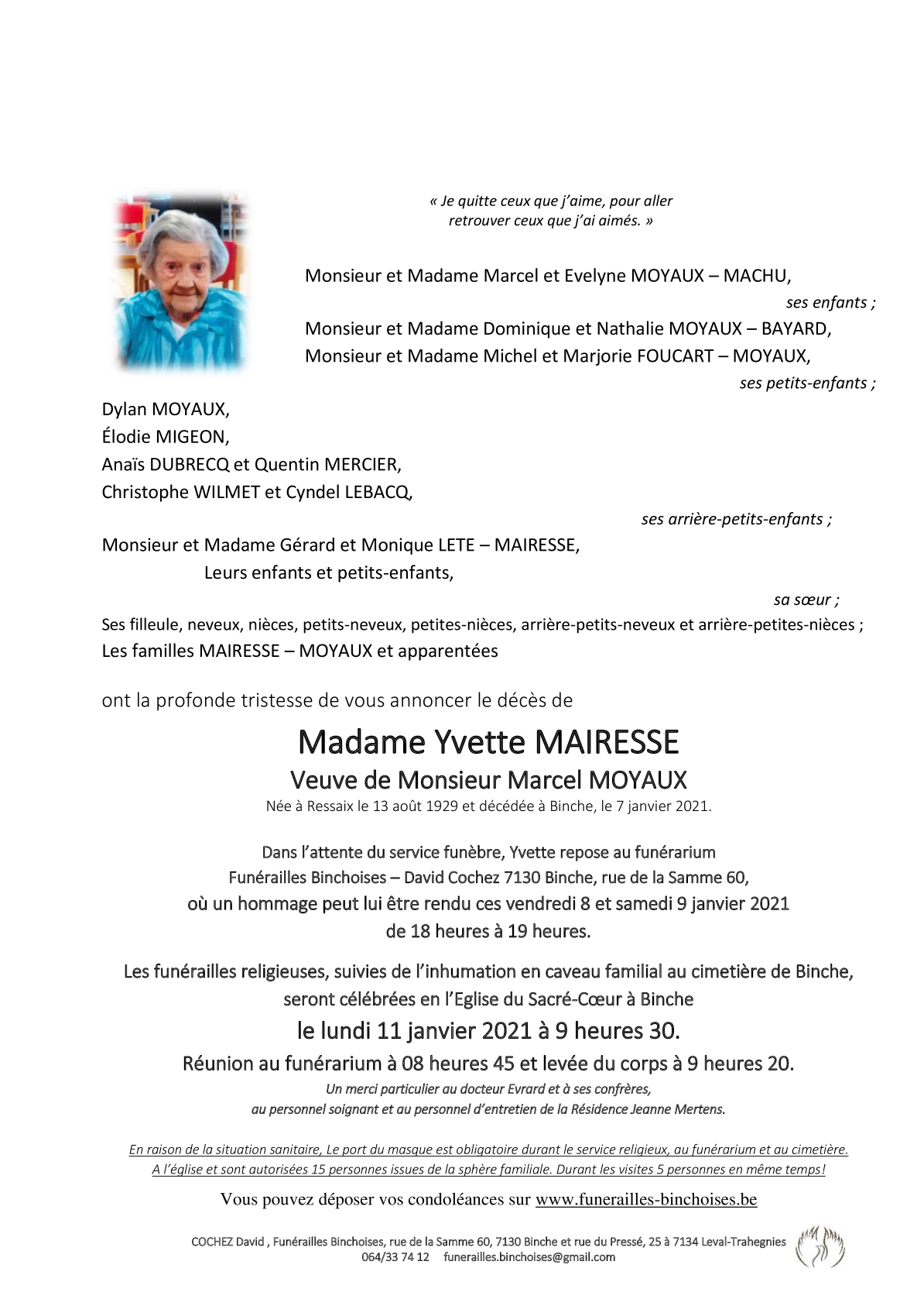 Fallecida en Binche (7130) el jueves, 7 de enero de 2021 a la edad de 91 años