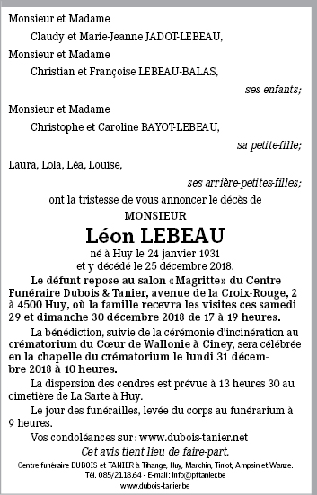 Décédé à Huy (4500) le mardi 25 décembre 2018 à l'âge de 87 ans