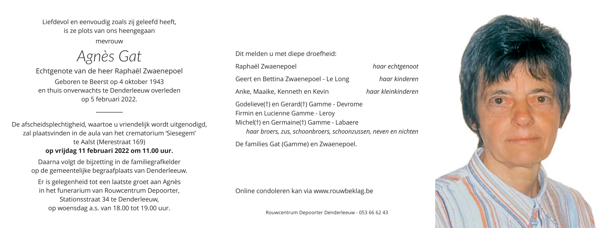 Fallecida en Denderleeuw (9470) el sábado, 5 de febrero de 2022 a la edad de 78 años