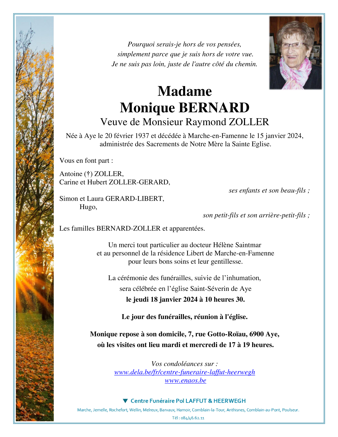 Décédée à Marche-en-Famenne (6900) le lundi 15 janvier 2024 à l'âge de 86 ans