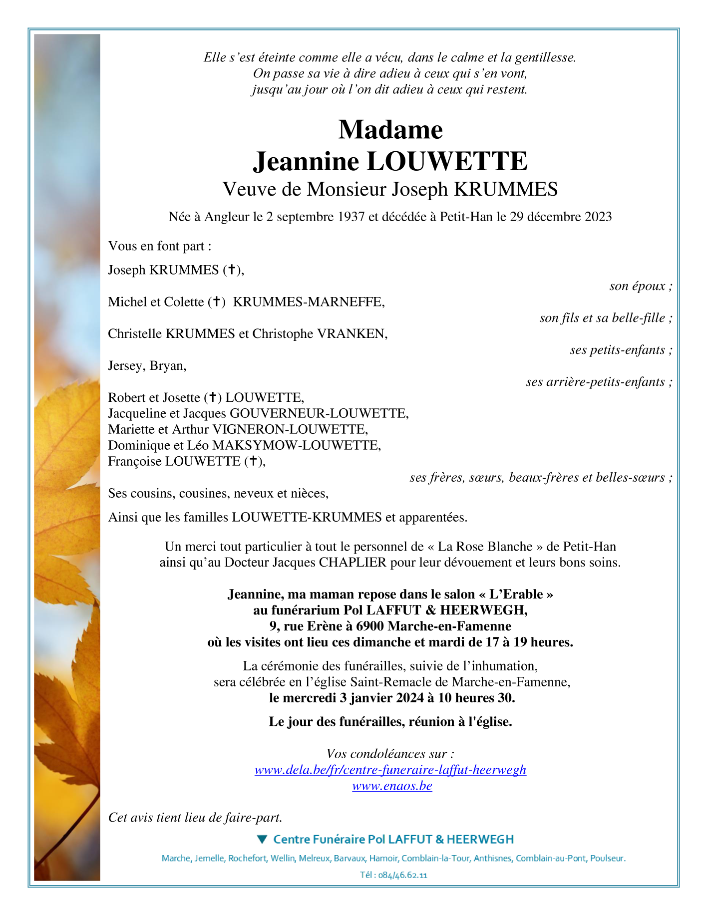 Décédée à Durbuy (6940) le vendredi 29 décembre 2023 à l'âge de 86 ans