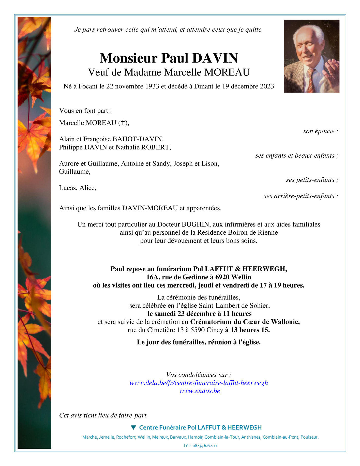 Né à Focant (5572) le mercredi 22 novembre 1933