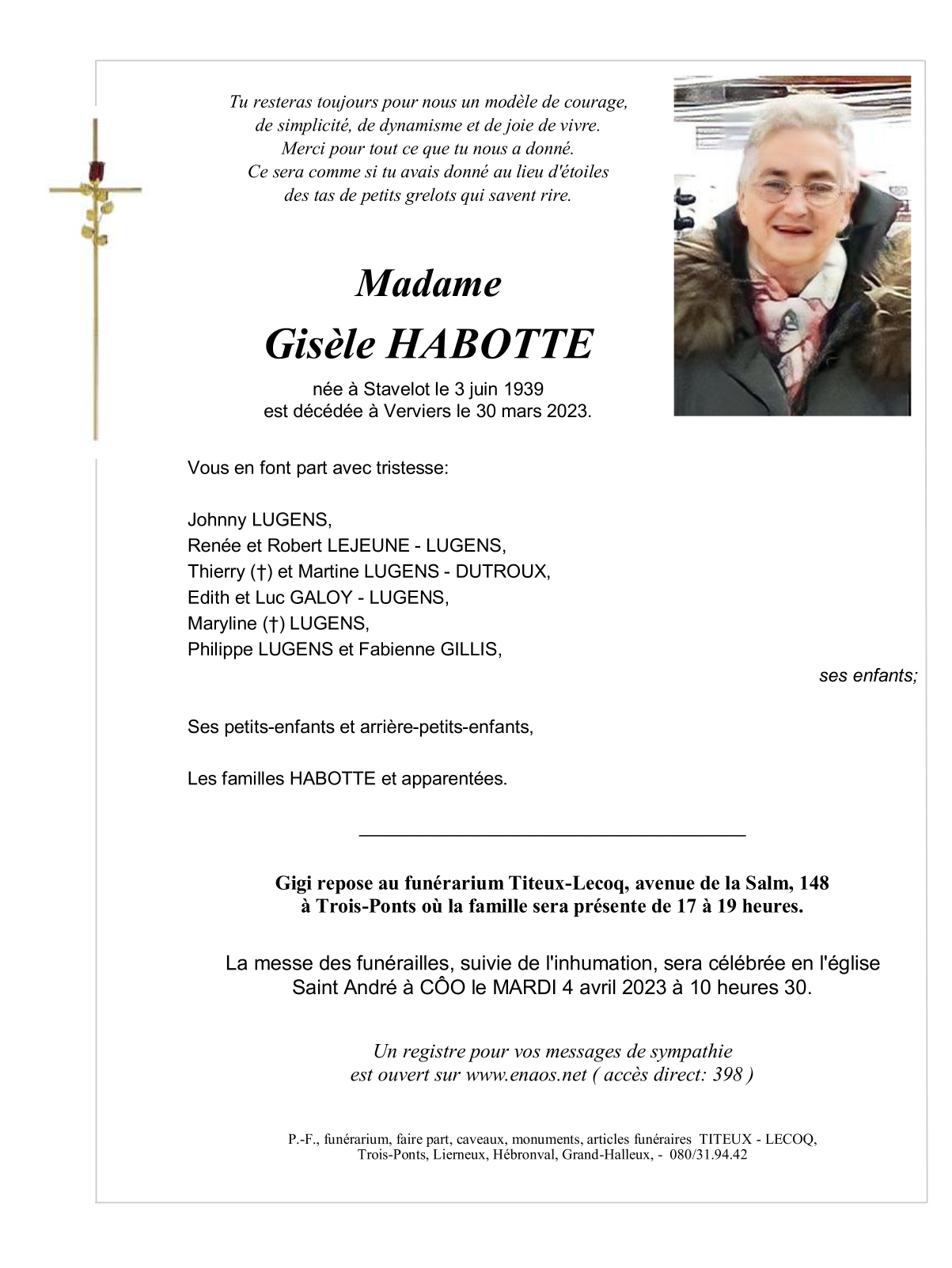 Décédée à Verviers (4800) le jeudi 30 mars 2023 à l'âge de 83 ans