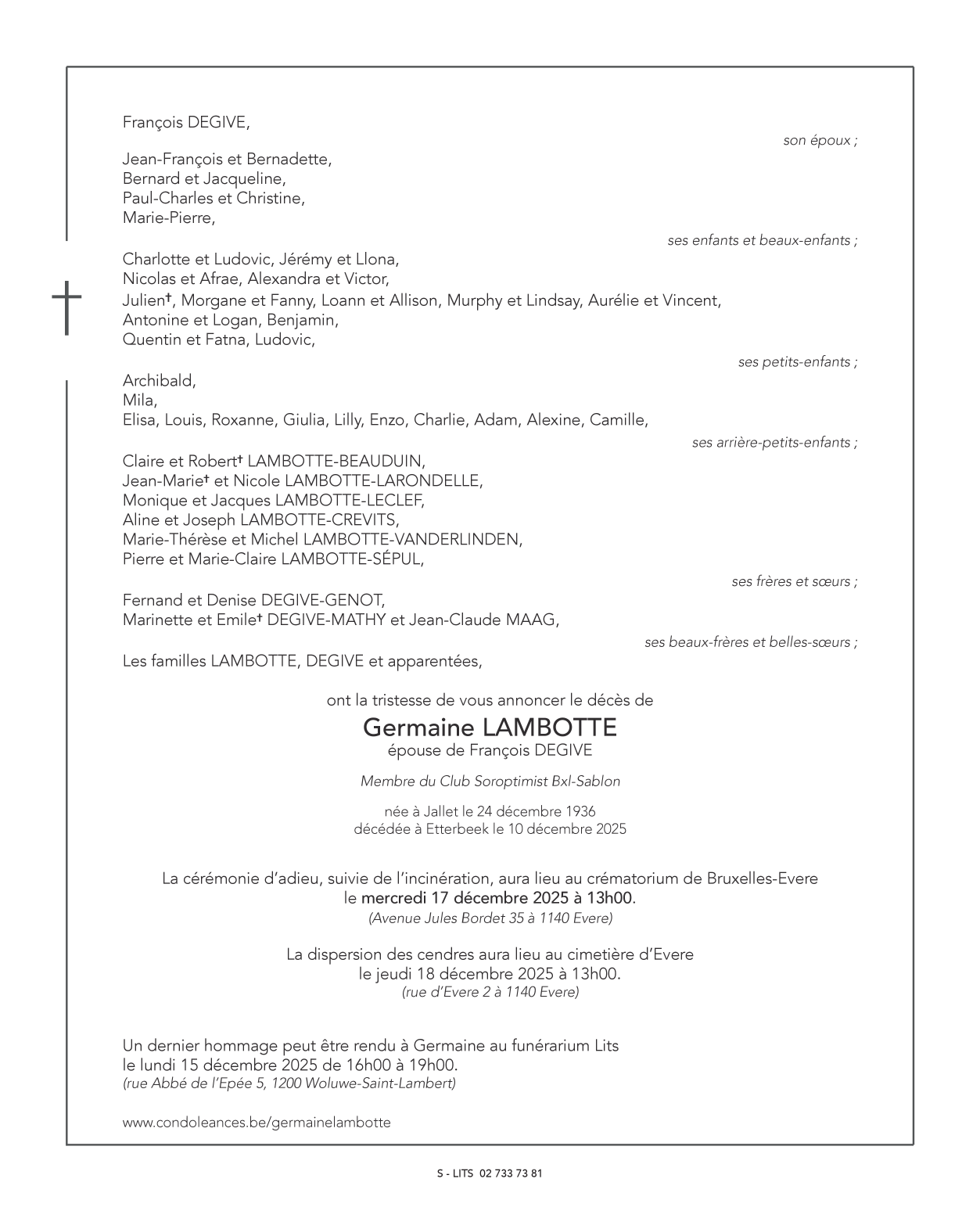 Décédée à Brussel (Etterbeek) (1040) le mercredi 10 décembre 2025 à l'âge de 88 ans