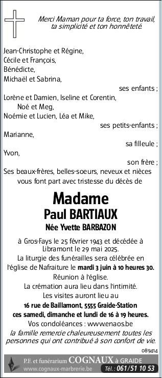Fallecida en Libramont (6800) el jueves, 29 de mayo de 2025 a la edad de 82 años