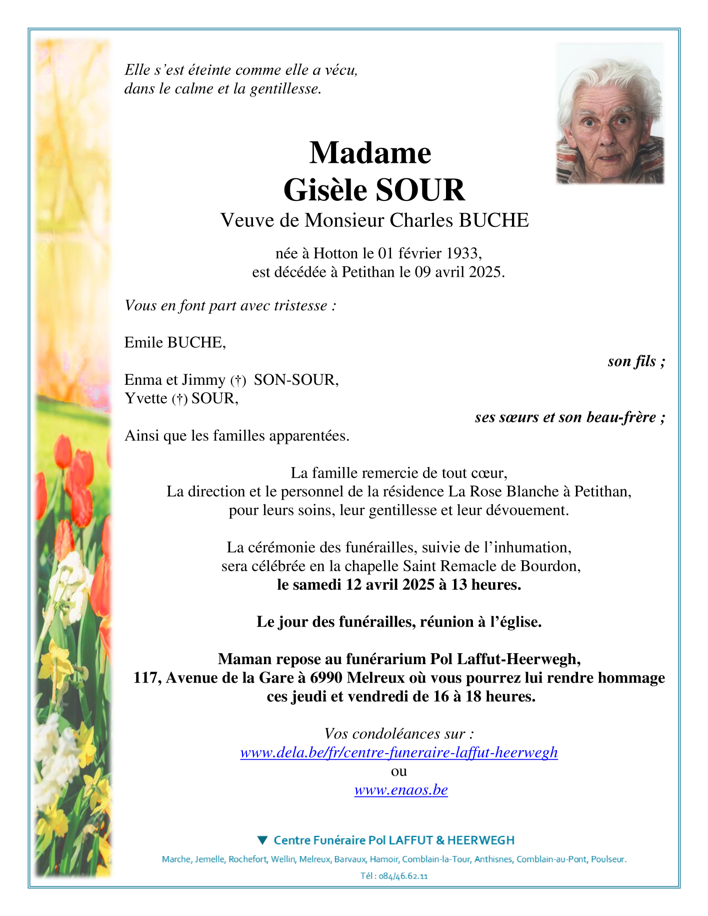 Fallecida en Petit-Han (6940) el miércoles, 9 de abril de 2025 a la edad de 92 años
