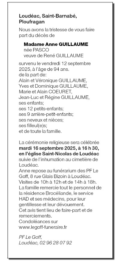 Décédée à Loudéac (22600, France) le vendredi 12 septembre 2025 à l'âge de 94 ans