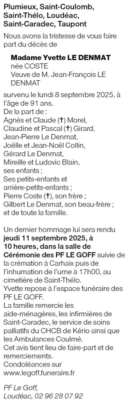 Décédée à Noyal-Pontivy (56920, France) le lundi 8 septembre 2025 à l'âge de 91 ans