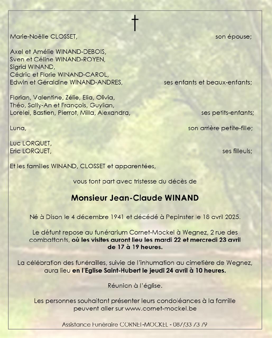 Fallecido en Pepinster (4860) el viernes, 18 de abril de 2025 a la edad de 83 años