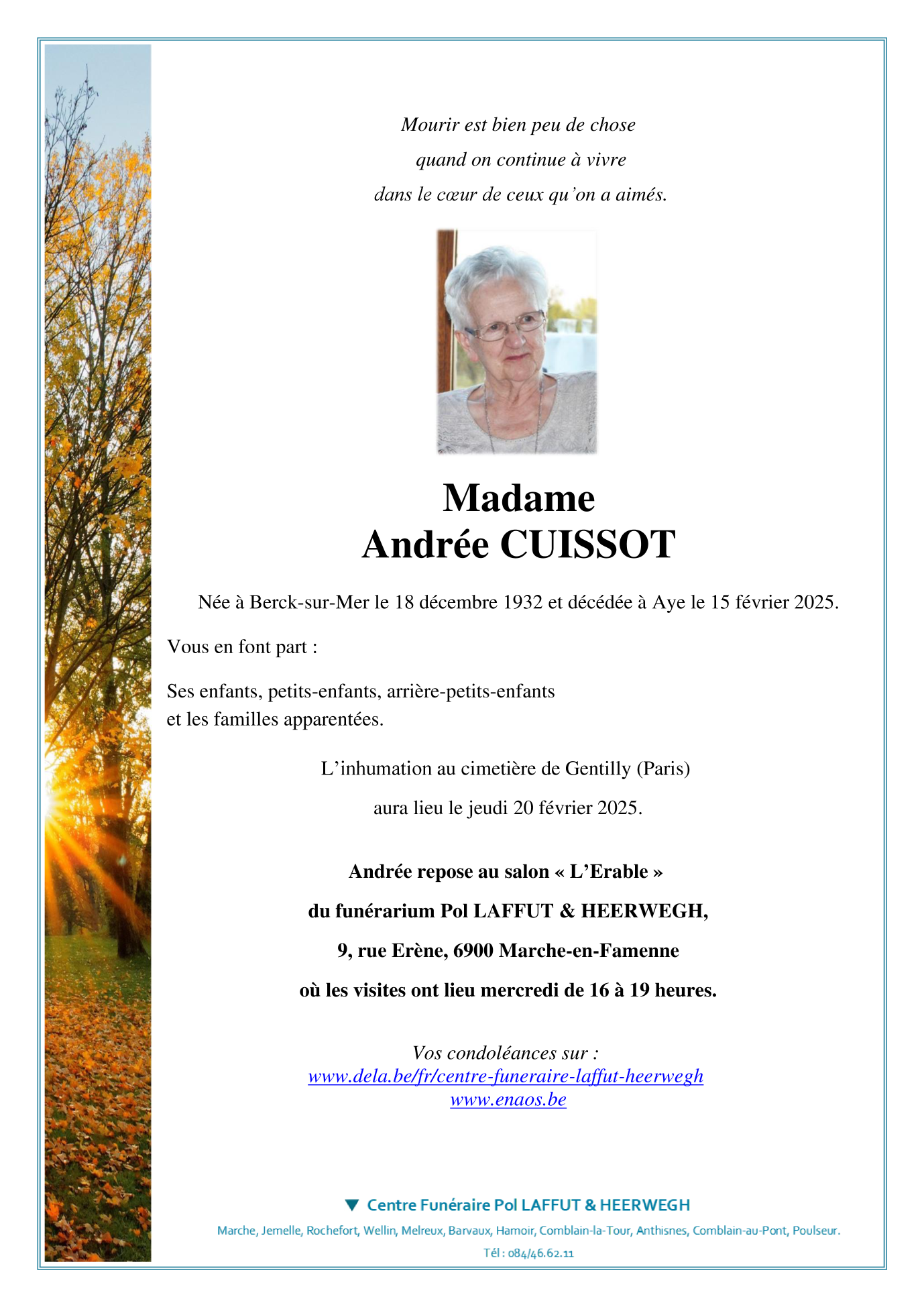 Overleden te Marche-en-Famenne (6900) op zaterdag 15 februari 2025 op 92-jarige leeftijd