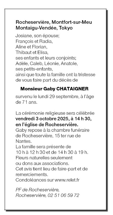 Décédé à Cugand (85610, France) le lundi 29 septembre 2025 à l'âge de 71 ans