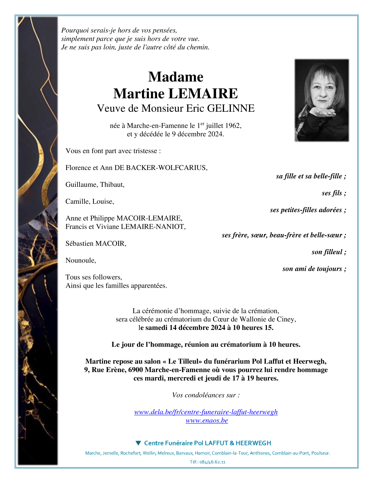 Décédée à Marche-en-Famenne (6900) le lundi 9 décembre 2024 à l'âge de 62 ans