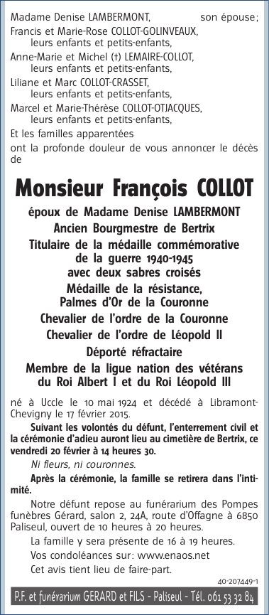 Décédé à Libramont (6800) le mardi 17 février 2015 à l'âge de 90 ans