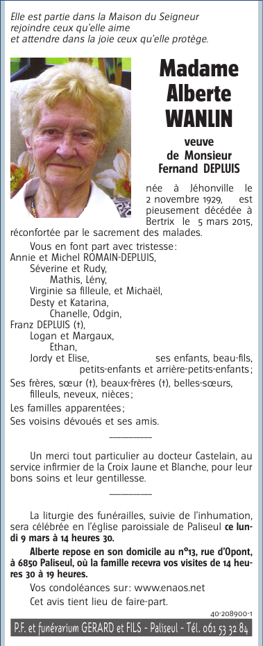 Died in Bertrix (6880) on 05 March 2015 at the age of 85 years