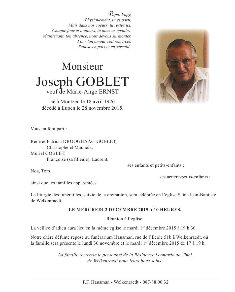 Décédé à Eupen (4700) le samedi 28 novembre 2015 à l'âge de 89 ans
