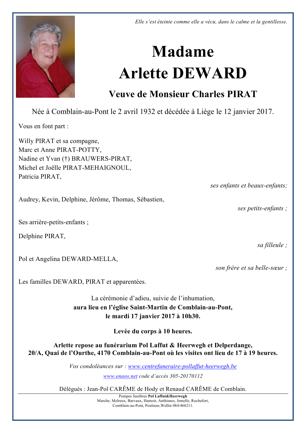 Died in Liège (4000) on 12 January 2017 at the age of 84 years