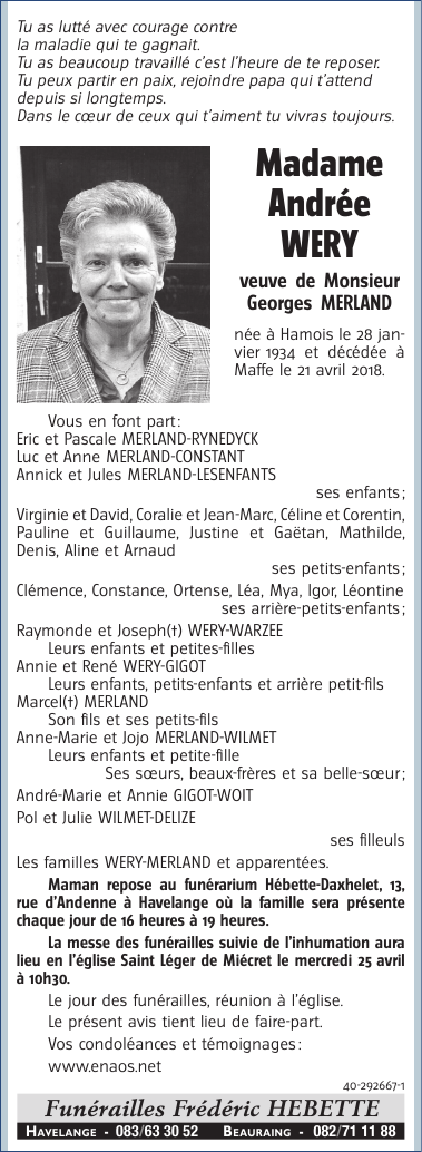 Décédée à Maffe (5374) le samedi 21 avril 2018 à l'âge de 84 ans