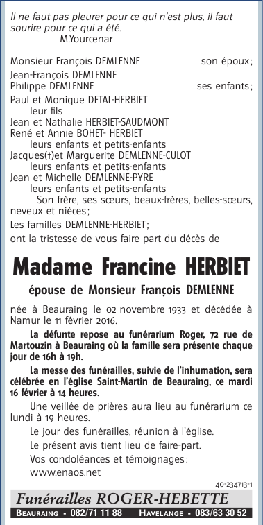 Fallecida en Namur (5000) el jueves, 11 de febrero de 2016 a la edad de 82 años