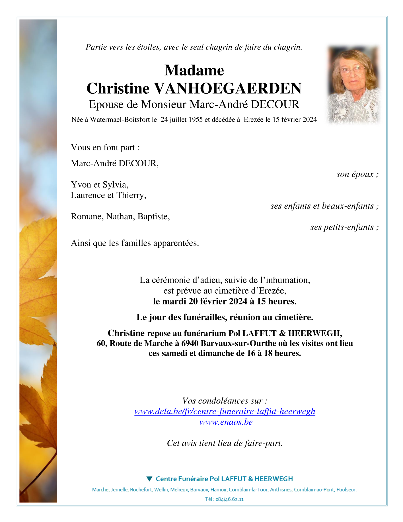 Décédée à Erezée (6997) le jeudi 15 février 2024 à l'âge de 68 ans