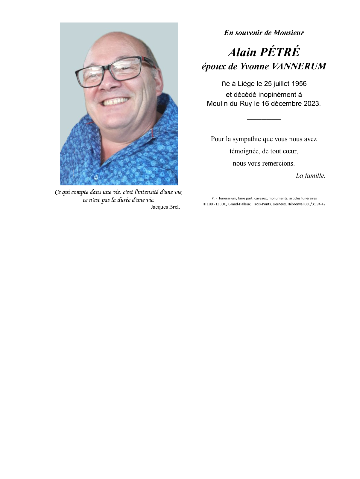 Décédé à Moulin du Ruy (4987) le samedi 16 décembre 2023 à l'âge de 67 ans