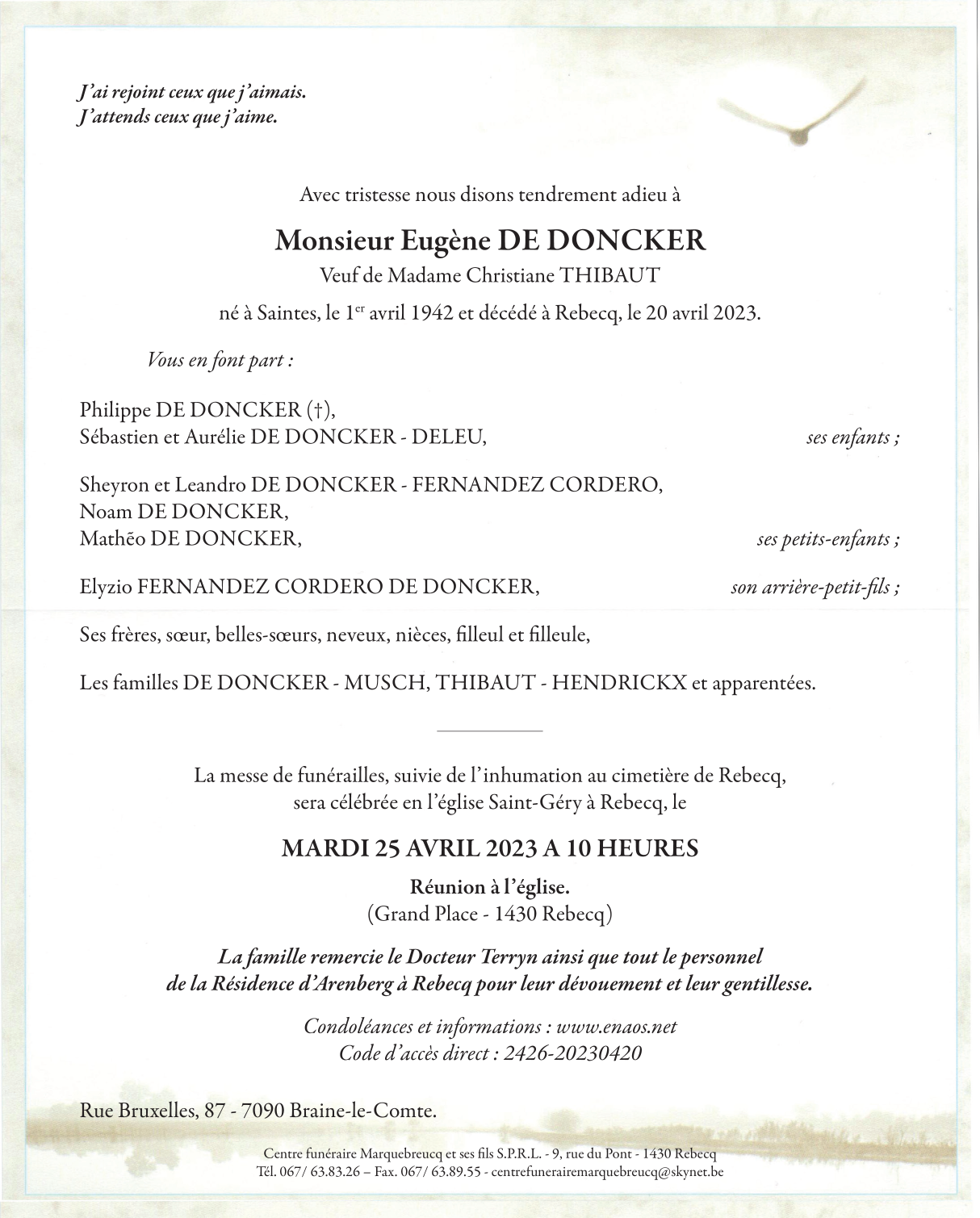 Décédé à Rebecq (1430) le jeudi 20 avril 2023 à l'âge de 81 ans