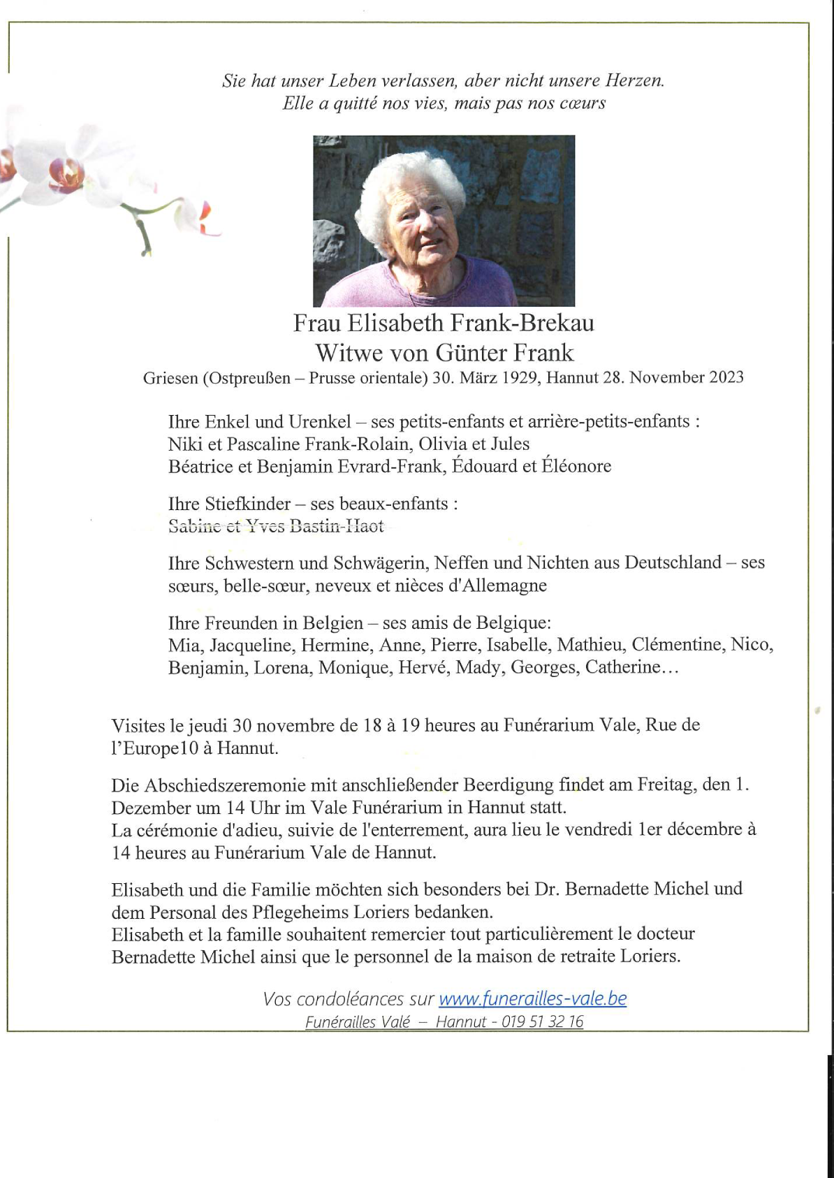 Décédée à Hannut (4280) le mardi 28 novembre 2023 à l'âge de 94 ans