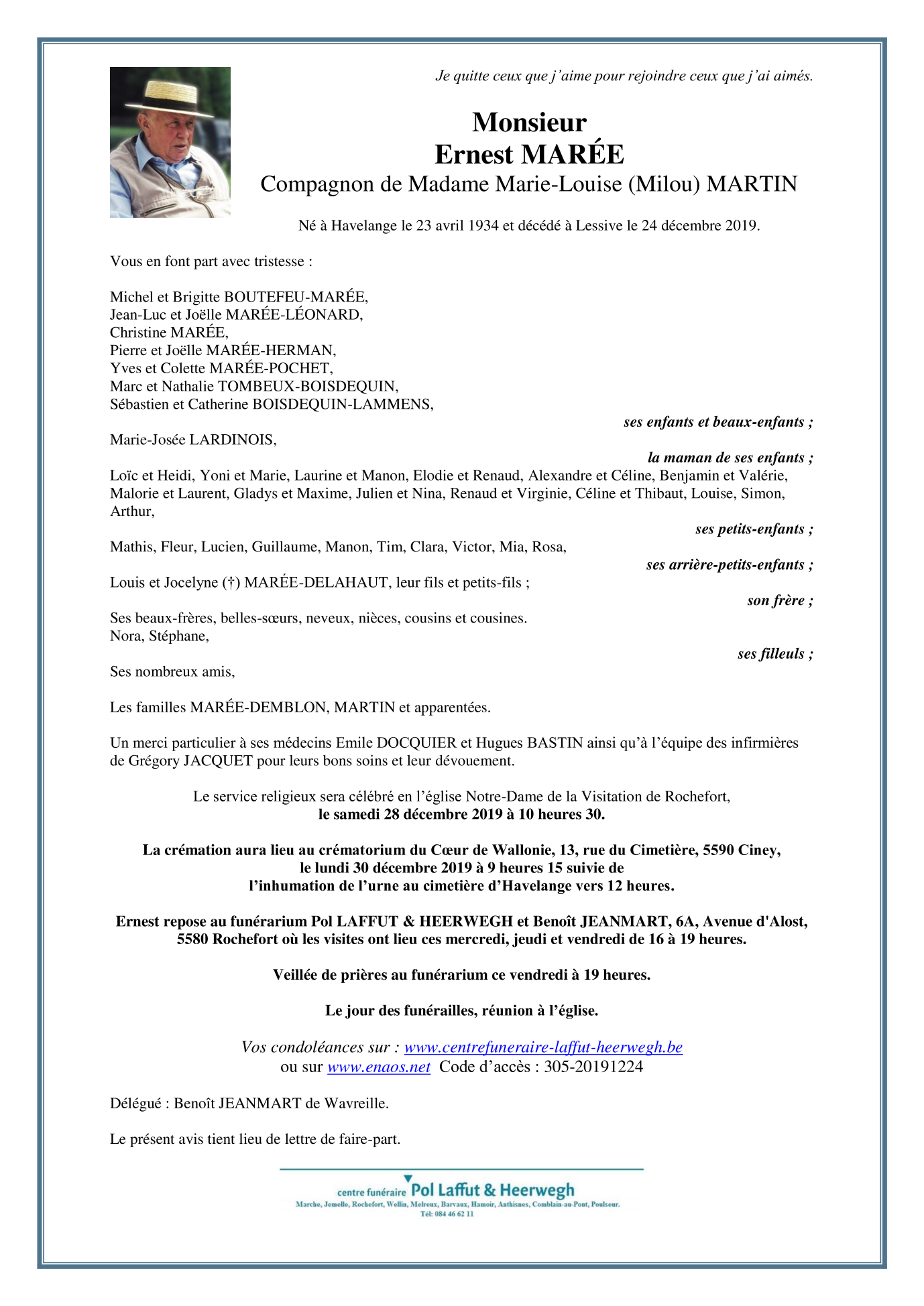 Overleden te Lessive (5580) op dinsdag 24 december 2019 op 85-jarige leeftijd