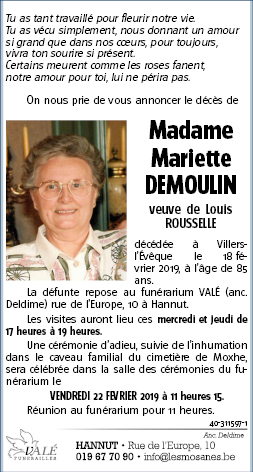 Overleden te Villers-l'Evêque (4340) op maandag 18 februari 2019 op 85-jarige leeftijd