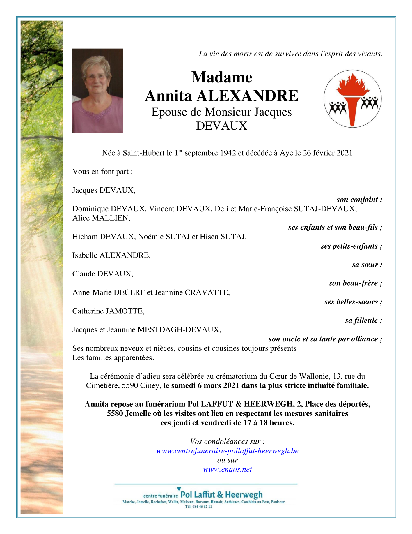 Fallecida en Aye (6900) el viernes, 26 de febrero de 2021 a la edad de 78 años