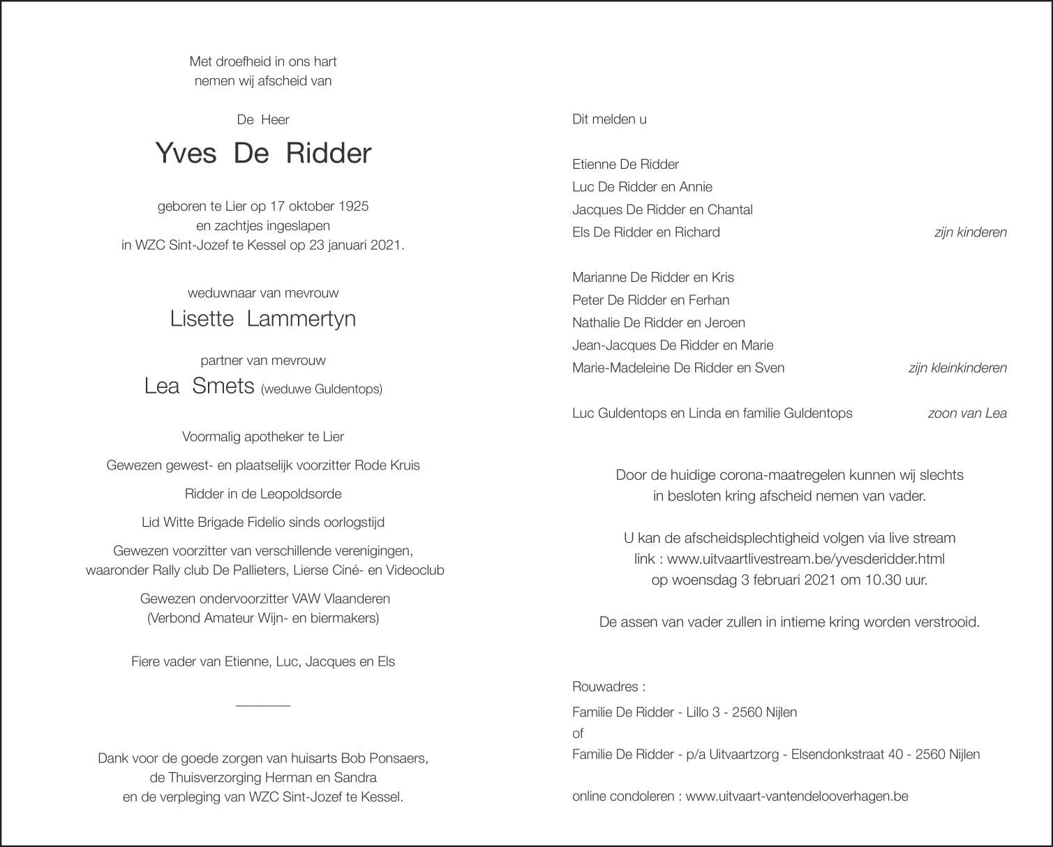 Décédé à Kessel (2560) le samedi 23 janvier 2021 à l'âge de 95 ans