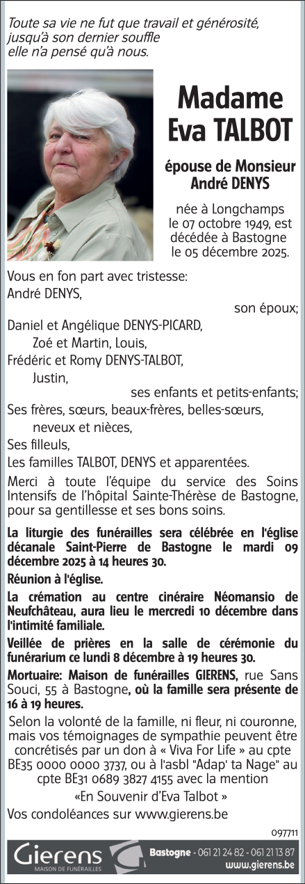 Décédée à Bastogne (6600) le vendredi 5 décembre 2025 à l'âge de 76 ans