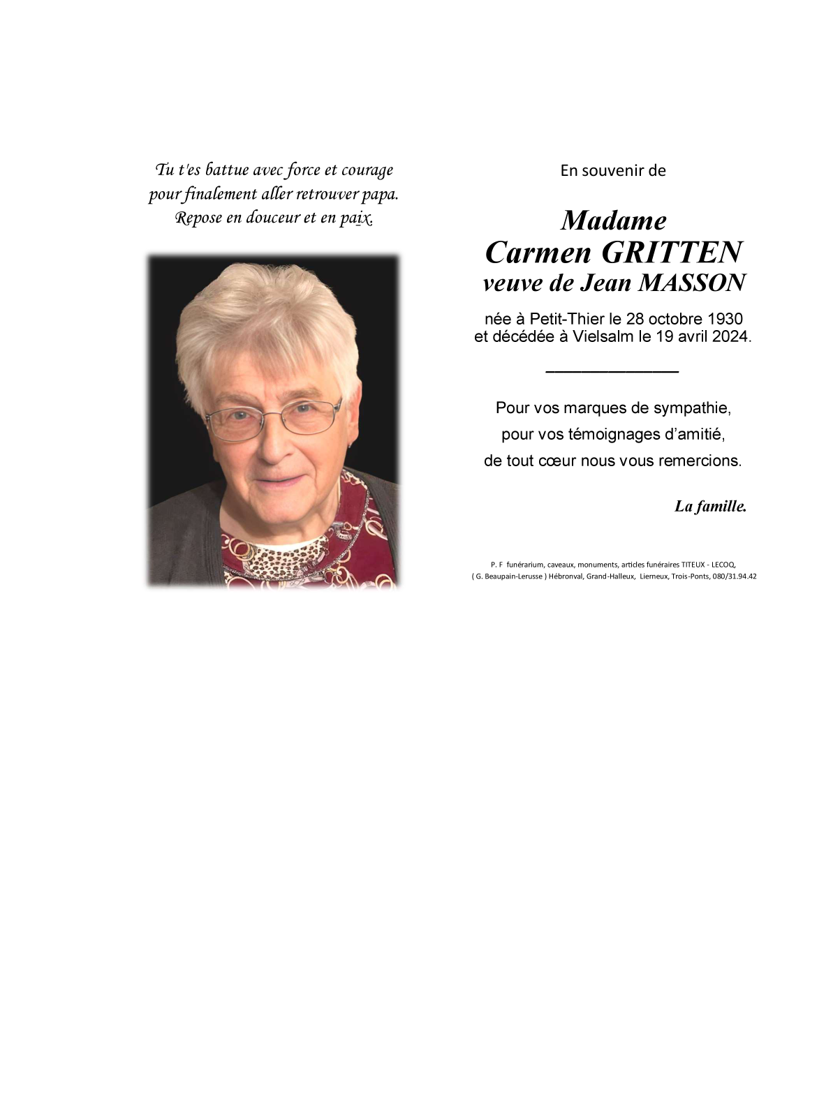 Died in Vielsalm (6690) on 19 April 2024 at the age of 93 years