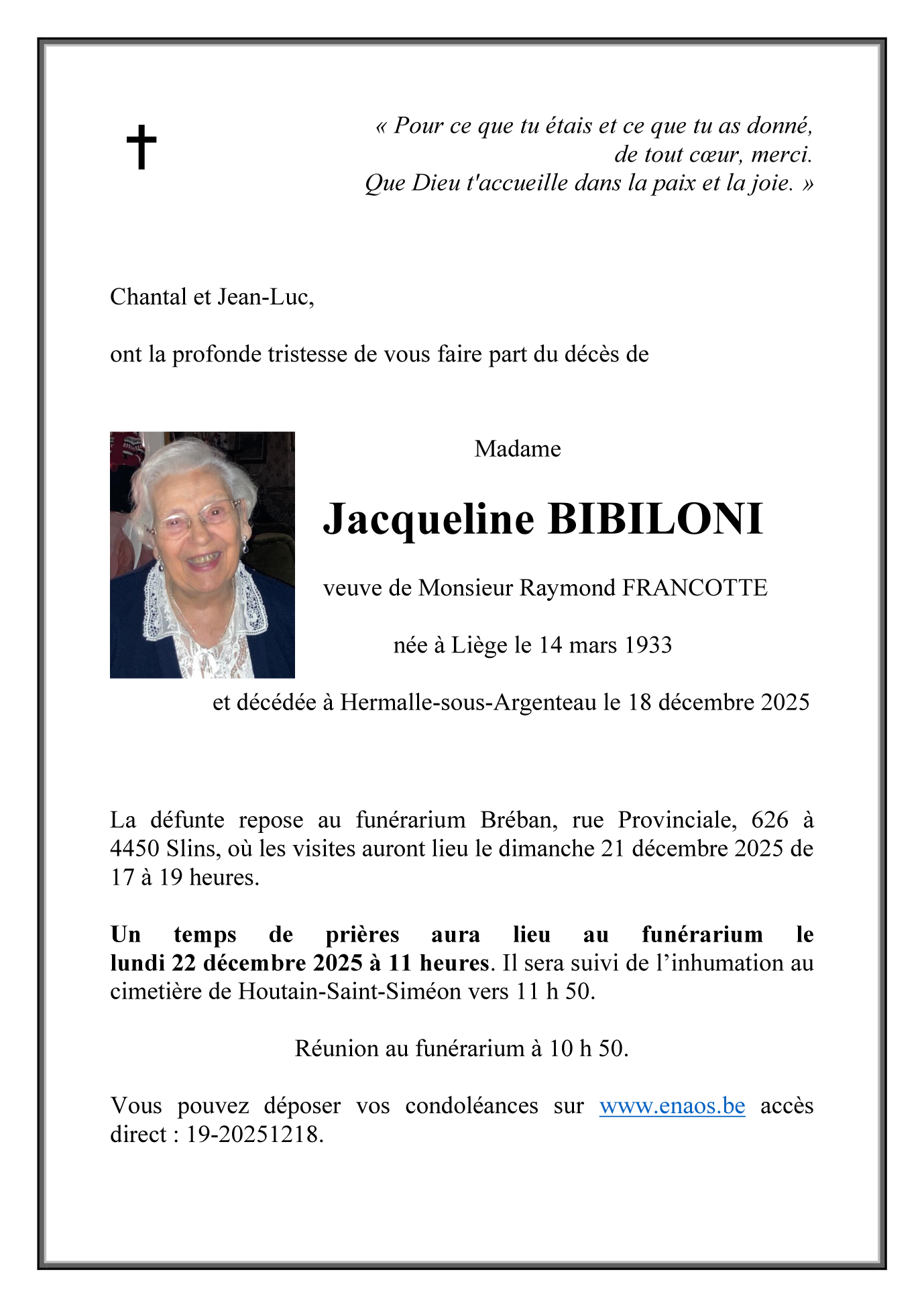 Madame Jacqueline BIBILONI veuve de Raymond FRANCOTTE